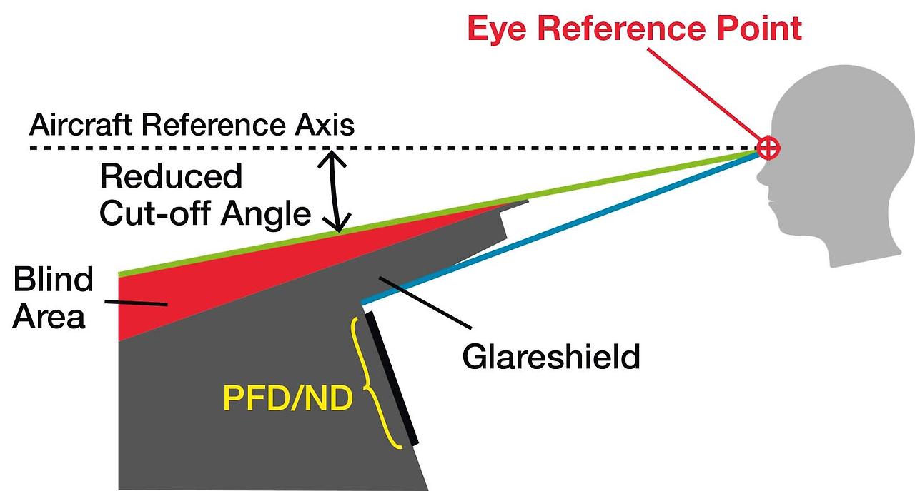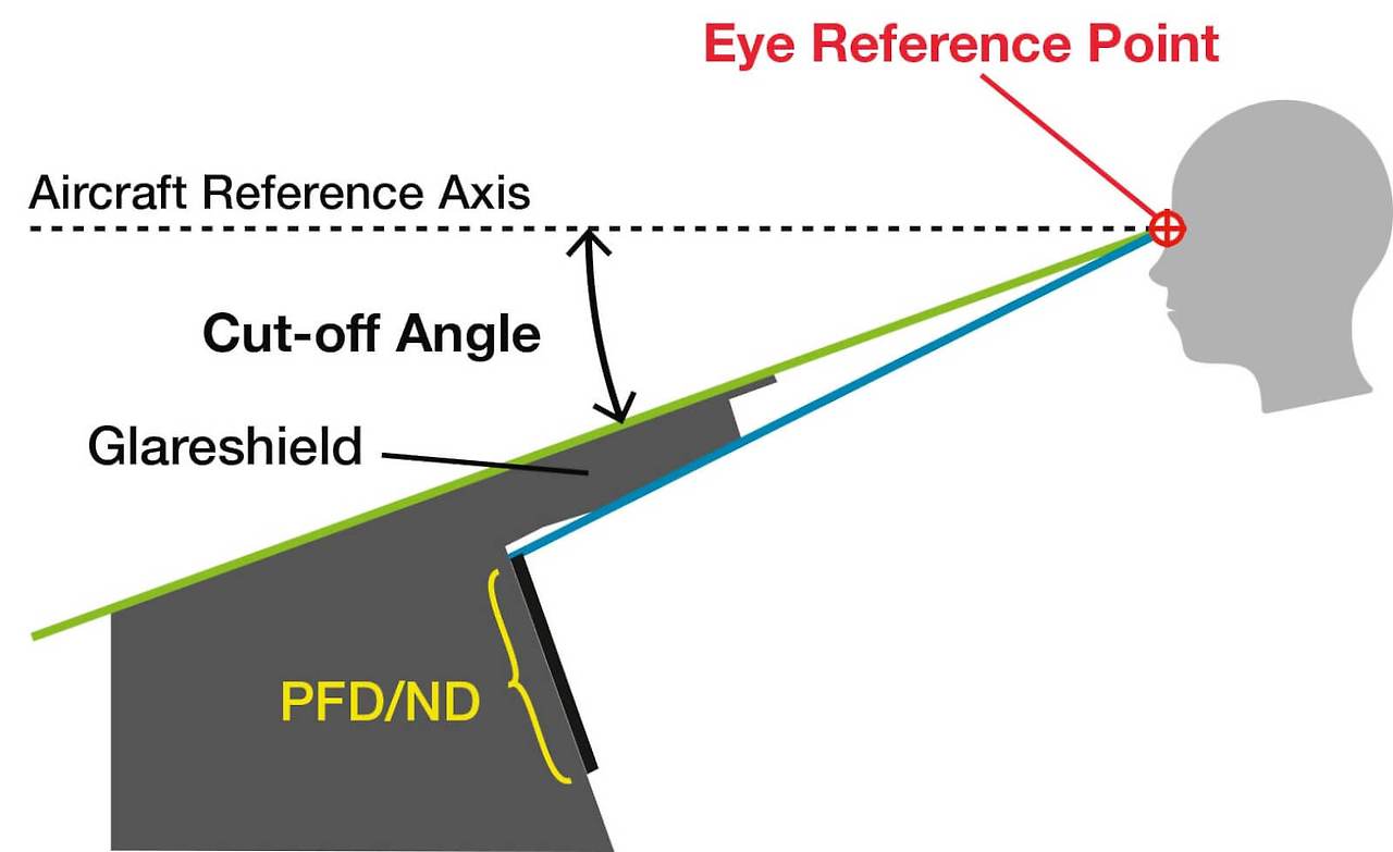 (Cut-off Angle이란 조종사의 시야에서 조종실 내부와 외부 사이의 시야의 각도로 이 각도 아래의 구역은 계기 및 패널로 인해 외부 시야의 사각지대가 괸다.)