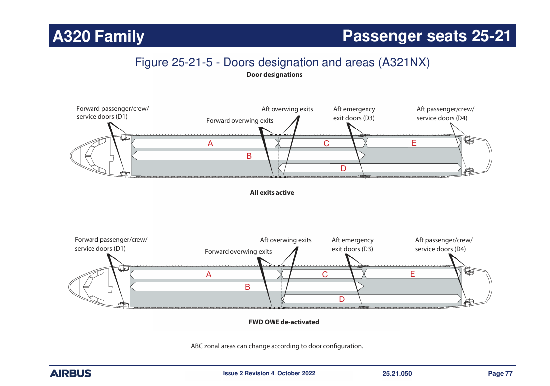 이 자료에서 보이는 A 지역에는 이코노미 단일이 아닌경우 비즈니스 등의 상위 클래스 좌석이 설치되어 뒤쪽에 비해 요구되는 비상구 사양이 낮을것이다. 그러므로 Door 2를 없애고 오버윙 exit을 설치하여 C D E 부근의 최대 좌석수 를 늘린것